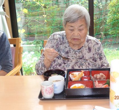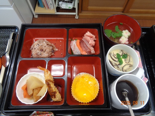 9月は敬老の日もありました。お弁当箱に刺身、エビフライ、茶わん蒸し、お赤飯などごちそうが並びました😋